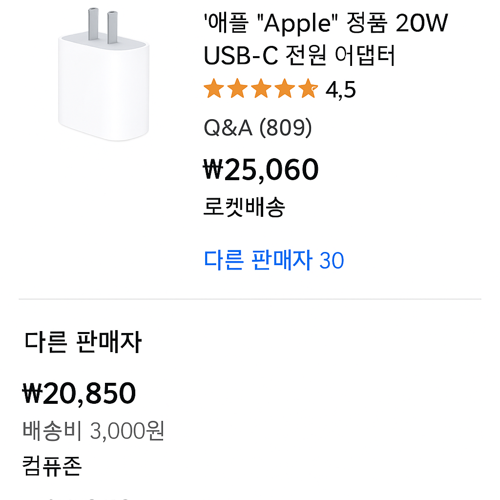 예를 들어 ‘애플 정품 20W 충전기’를 10명의 판매자가 쿠팡에 등록했다고 가정해보겠습니다. 쿠팡 시스템은 이 상품을 하나의 대표 상품 페이지로 묶고, 이전에 해당 제품에 쌓인 리뷰들을 모든 판매자에게 공유합니다.